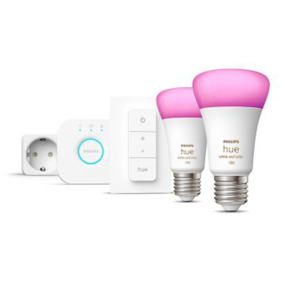 - Startpakke, hvor der medfølger 3 stk. LED E27-pærer samt Hue Bridge, Dimmer Switch og en Smart Plug.
